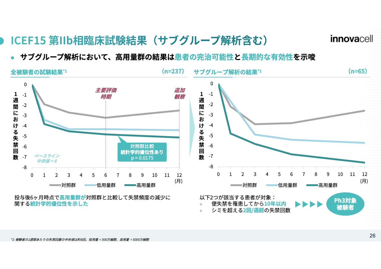 通常ですと統計学的有意性はフェーズ3で見せるものですが、我々はそれをフェーズ2bで見せています。競合と比べてどのような結果が出ているかというと、あくまでも単純比較なので一概には言えませんが、少なくとも我々が行っている自家筋芽細胞と電気刺激を組み合わせた臨床試験の結果では、「ICEF15」の有効性が高いことが示されています。