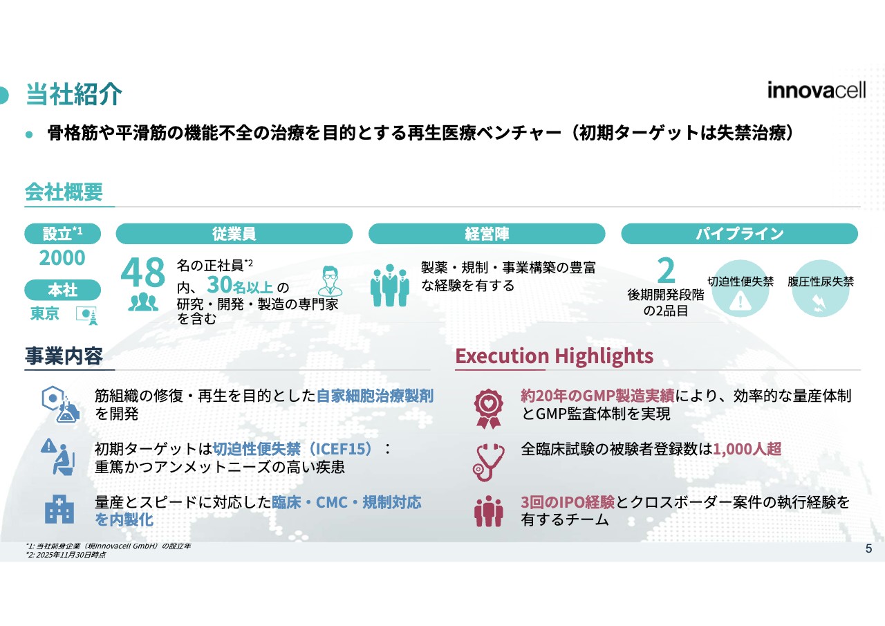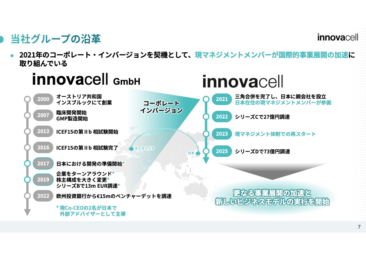 続いて、当社紹介です。前身企業であるオーストリアの会社の設立が2000年、イノバセル株式会社で三角合併を用いて親会社化したのが2021年という歴史を持つ会社です。