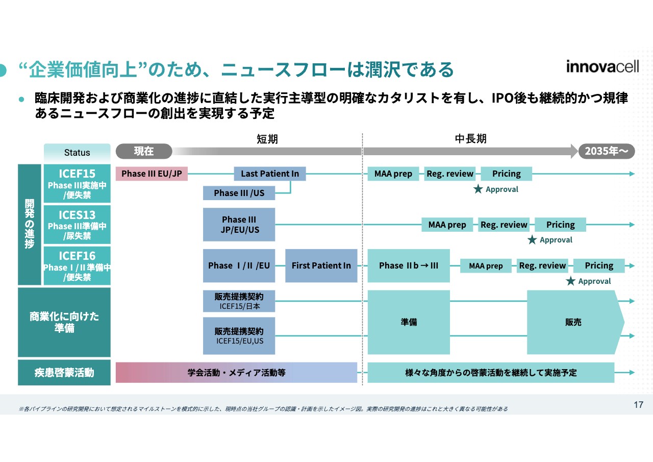 質問者:短期のニュースフローにすべてのパイプラインの臨床試験を開始されるような記載がありますが、今回調達された資金は、「ICEF15」の第Ⅲ相の完遂だけでなく、「ICES13」と「ICEF16」の臨床試験の実施費用まで含まれているのでしょうか?