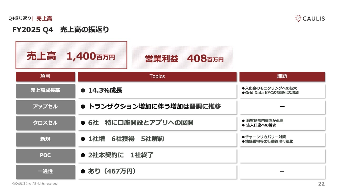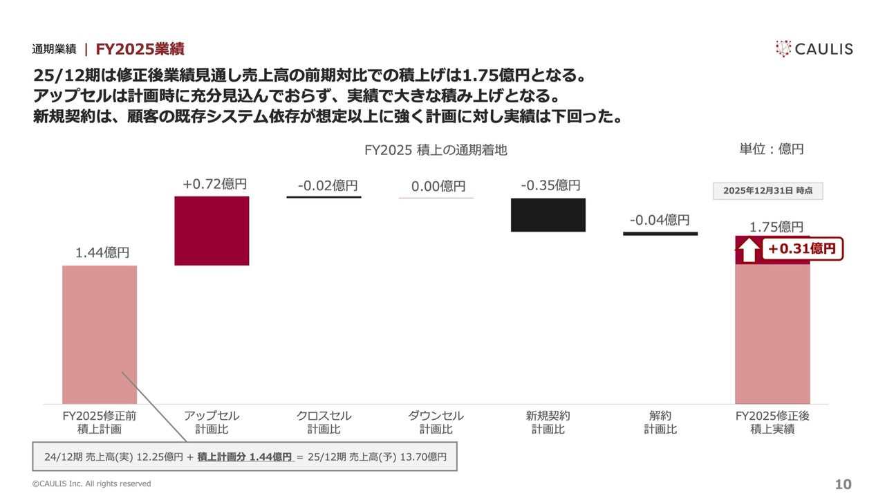 結果として、アップセルが想定以上に伸び、売上高の積み増しに大きく貢献しました。一方、新規契約については、顧客の既存システムへの依存が想定以上に強く、計画に対して実績が下振れしています。