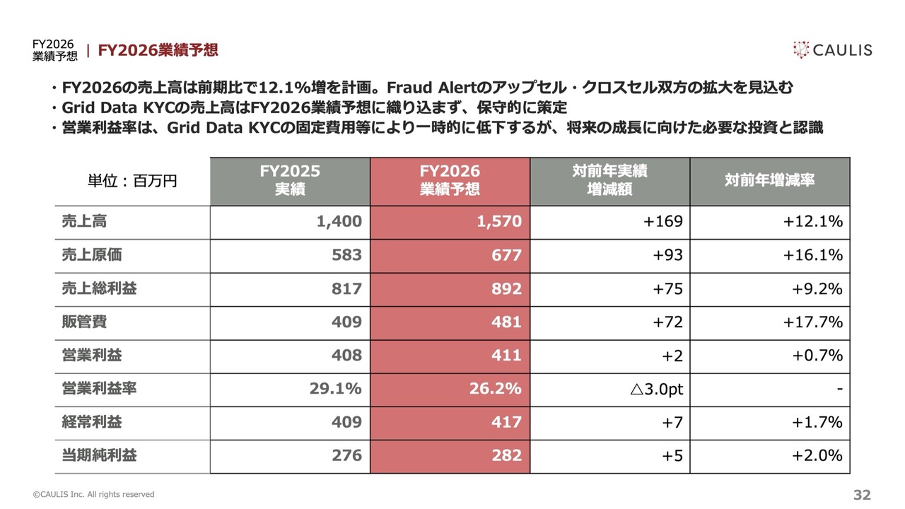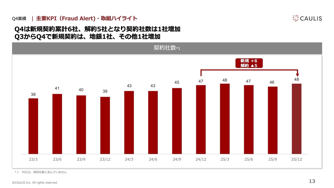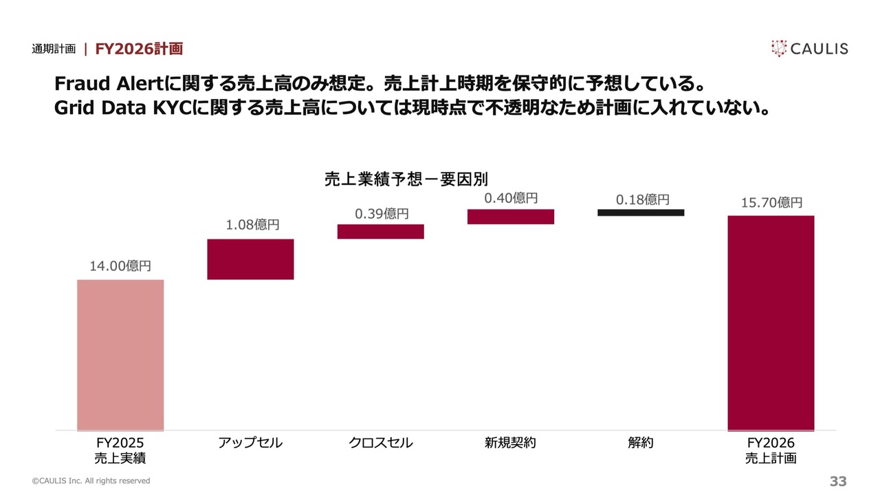 契約獲得高についてですが、「Fraud Alert」だけでなく、すべての契約金額が対象となっています。参考までに、契約残高5億8,510万円のうち、2026年第1四半期に売上高として計上される金額はおよそ30パーセントです。