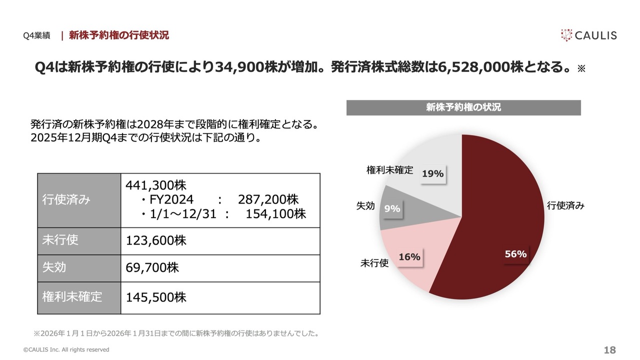 新株予約権の行使状況についてです。通期での権利行使は15万4,100株で、これにより発行済株式総数は652万8,000株となりました。当社の新株予約権にはべスティング条項があり、行使期限が到来していないものが14万5,500株あります。行使状況の詳細についてはスライドをご覧ください。