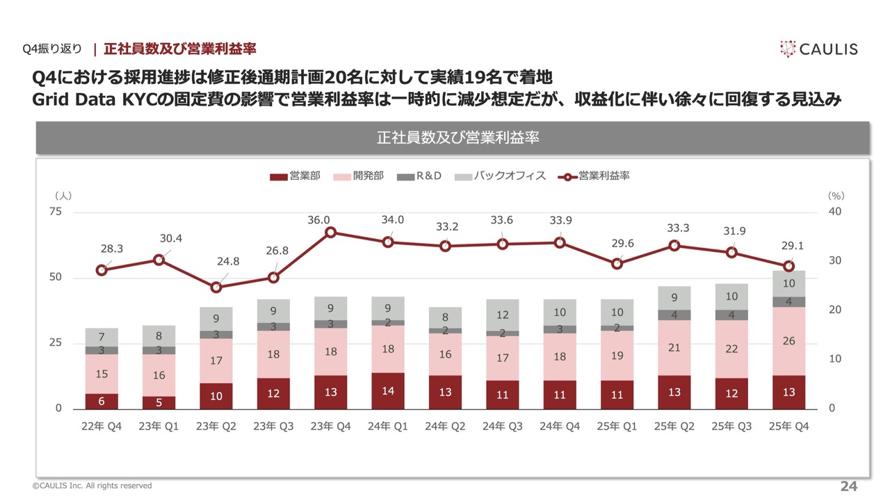 従業員数と営業利益率についてですが、昨年は修正後の採用計画20名に対して実績として19名で着地しました。ヘッドカウントは想定どおりですが、「Grid Data KYC」の持ち出し費用が一定数発生しているため、新規案件を積極的に獲得して固定費をカバーする必要があります。