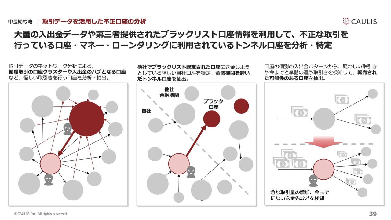 やってみるとすぐに、1週間で40口座以上の不正口座を発見する事例も現れています。このネットワーク分析をさらに拡販していく計画を進めていきます。