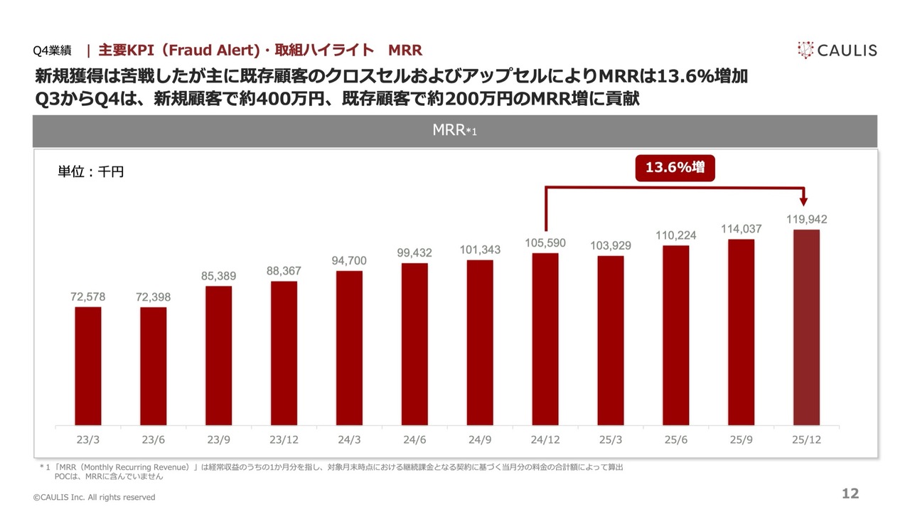 当期2025年12月期における期末時点のMRRは前期2024年12月期に対し13.6パーセント増加し、1億550万円から1億1,990万円となりました。主な要因は、既存顧客のトランザクション増加に伴う売上の増加です。