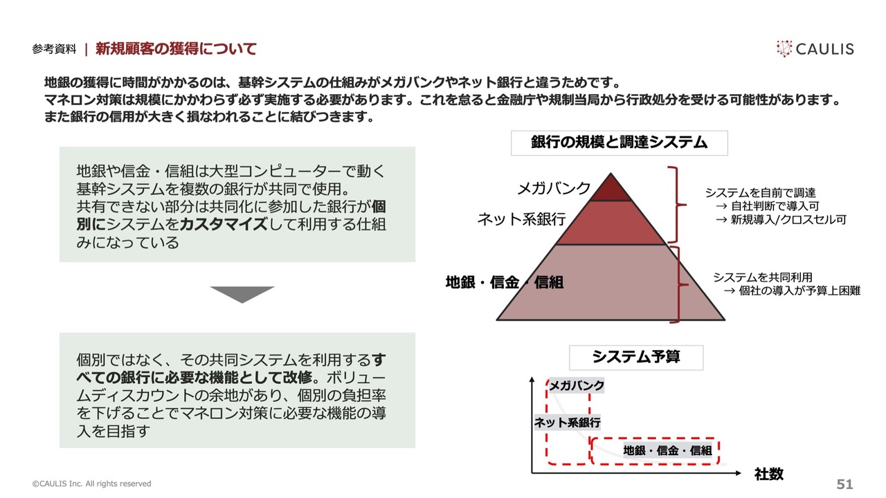 ネット銀行は他のネット銀行を参考にし、地方銀行は他の地方銀行を基準にする傾向があるため、それぞれ事例を作成し、横展開することができれば、顧客企業内での検討プロセスを短縮できるようになると考えています。