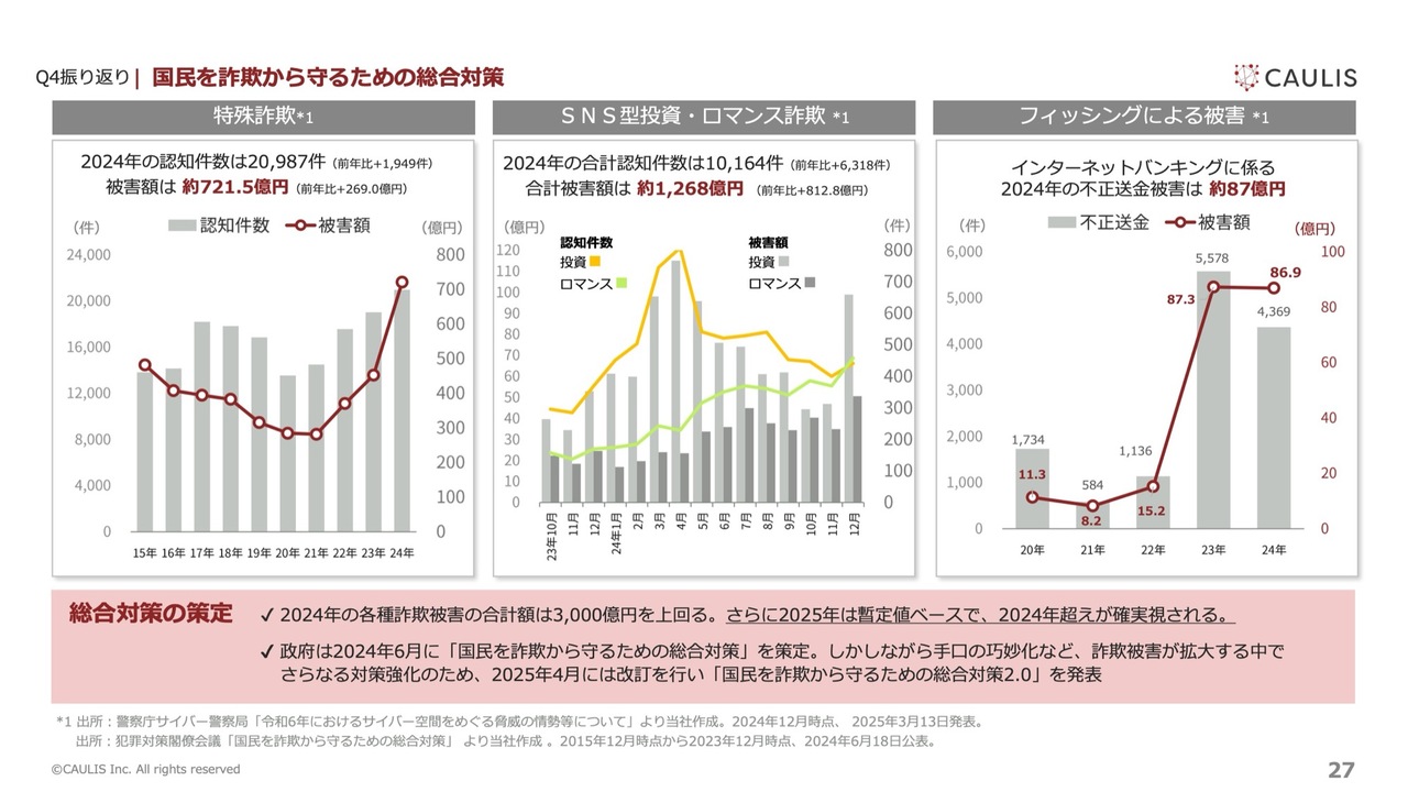 スライドのグラフは2024年時点の各種詐欺被害額に関するデータです。これは少し古い情報ですが、2024年と2025年を比較すると、2025年のほうが上回って推移しています。高市政権下でも、国民を詐欺から守る動きは今後も継続されると考えていますので、このような定性的な環境は、当社にとっては追い風になると感じています。