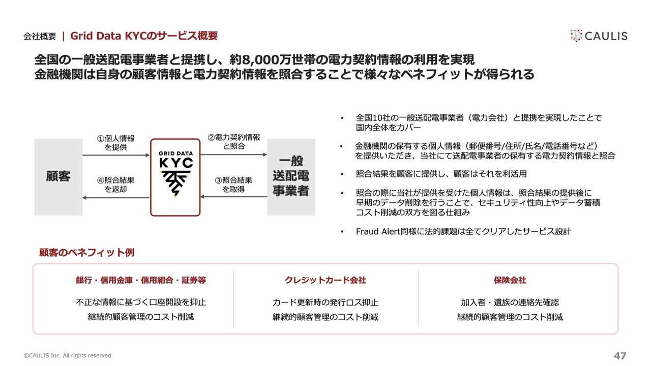 当期の主な取り組みとしては、9月18日に「Grid Data KYC」をリリースしました。このサービスは金融機関向けで、電力契約情報を活用した本人確認サービスです。導入した金融機関は、自社顧客情報と電力契約情報を照合することで、不正口座の開設防止や顧客管理コストの削減を図ることができます。