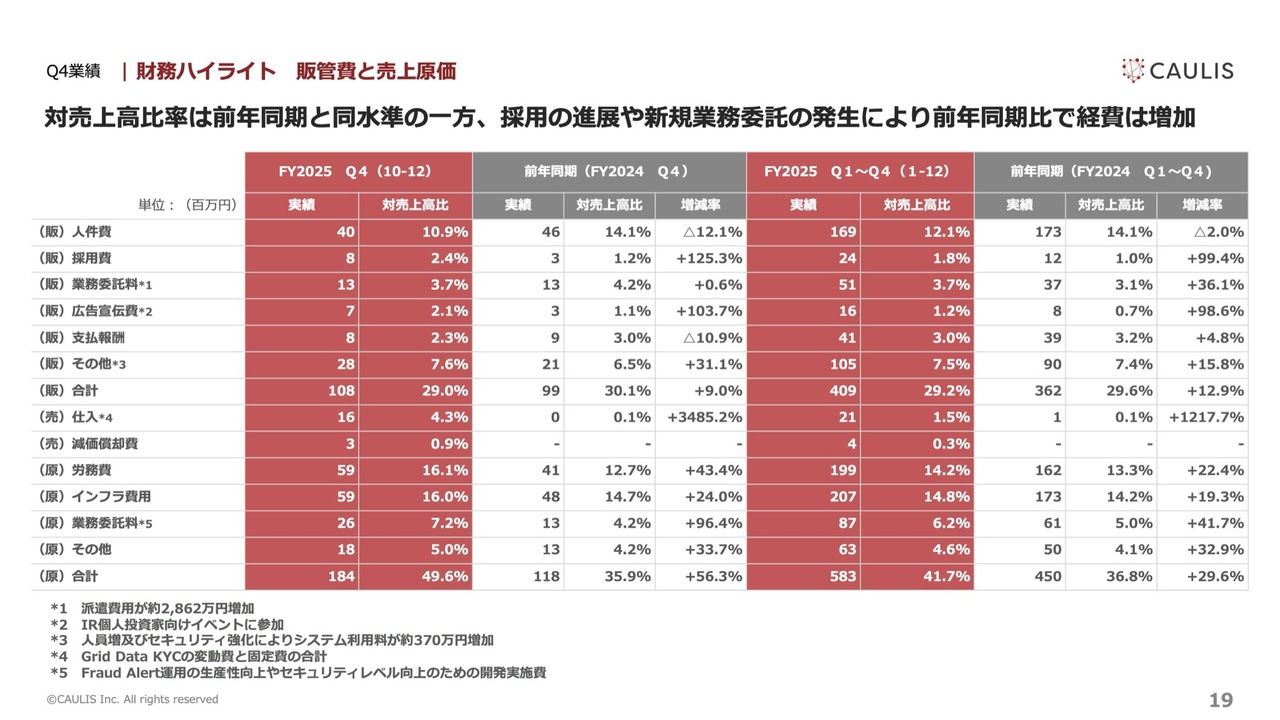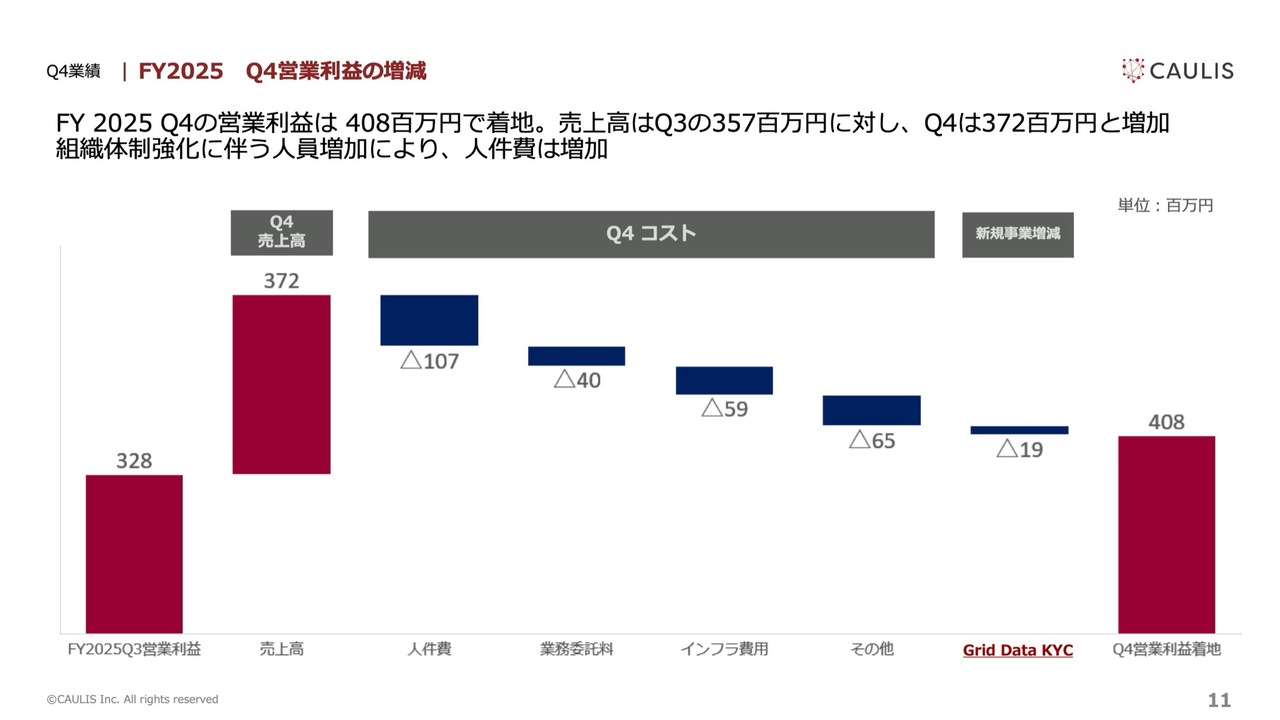売上増による増加は3億7,200万円です。コスト面では、人件費と業務委託費を含む人件関連の費用が合計で約1億4,700万円、サーバー費用などのインフラコストが約5,900万円、「Grid Data KYC」のコストが約1,900万円となりました。