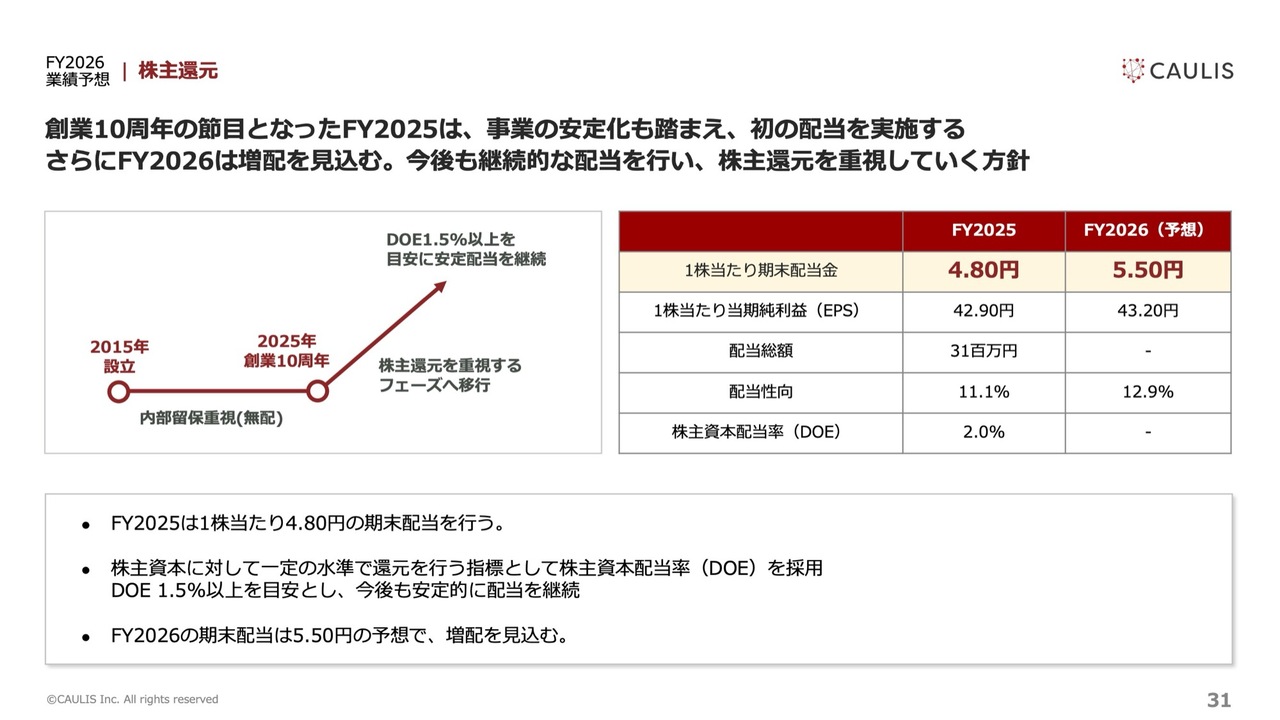 最後に、株主還元についてです。創業10年目という節目と、7年をかけた「Grid Data KYC」のリリースが実現したことを受け、1株当たり4.8円の配当を実施することを決定しました。今後もDOE1.5パーセント以上を目安に、安定配当を継続する方針です。