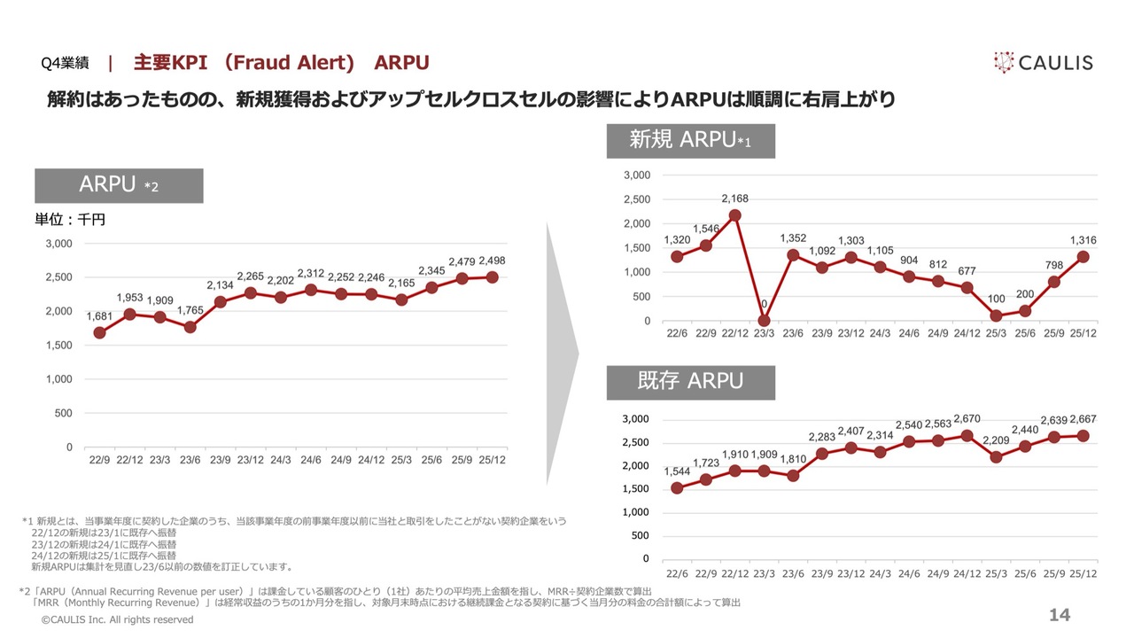 全体では、第3四半期の約247万円から第4四半期の約249万円へと増加しています。増加の要因は、新規、既存の両方のARPUが向上したことによります。スライド右上の新規ARPUは、単価の高い取引モニタリングでの獲得によって上昇しました。また、スライド右下の既存ARPUは、堅調なアップセルとクロスセルが実現したことで上昇しています。