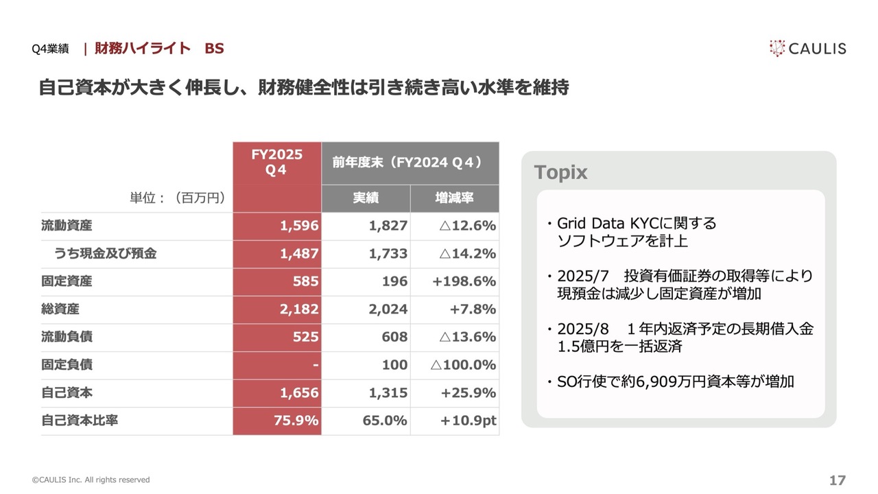 業績結果のサマリーです。B/Sはスライドのとおりです。ソフトウェアはすべて新規事業「Grid Data KYC」のデータを照合するためのものになっています。