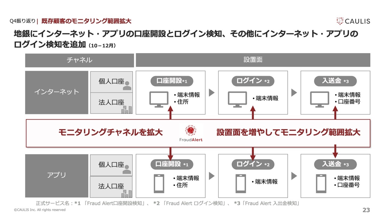 次に、主力サービス「Fraud Alert」についてです。顧客のトランザクション増加に伴い、トラフィックのストック売上が増加し堅調に推移しました。モニタリング利用シーンの拡大についても、ほぼ計画どおりに推移しています。一方、地方銀行の新規顧客獲得については苦戦しました。
