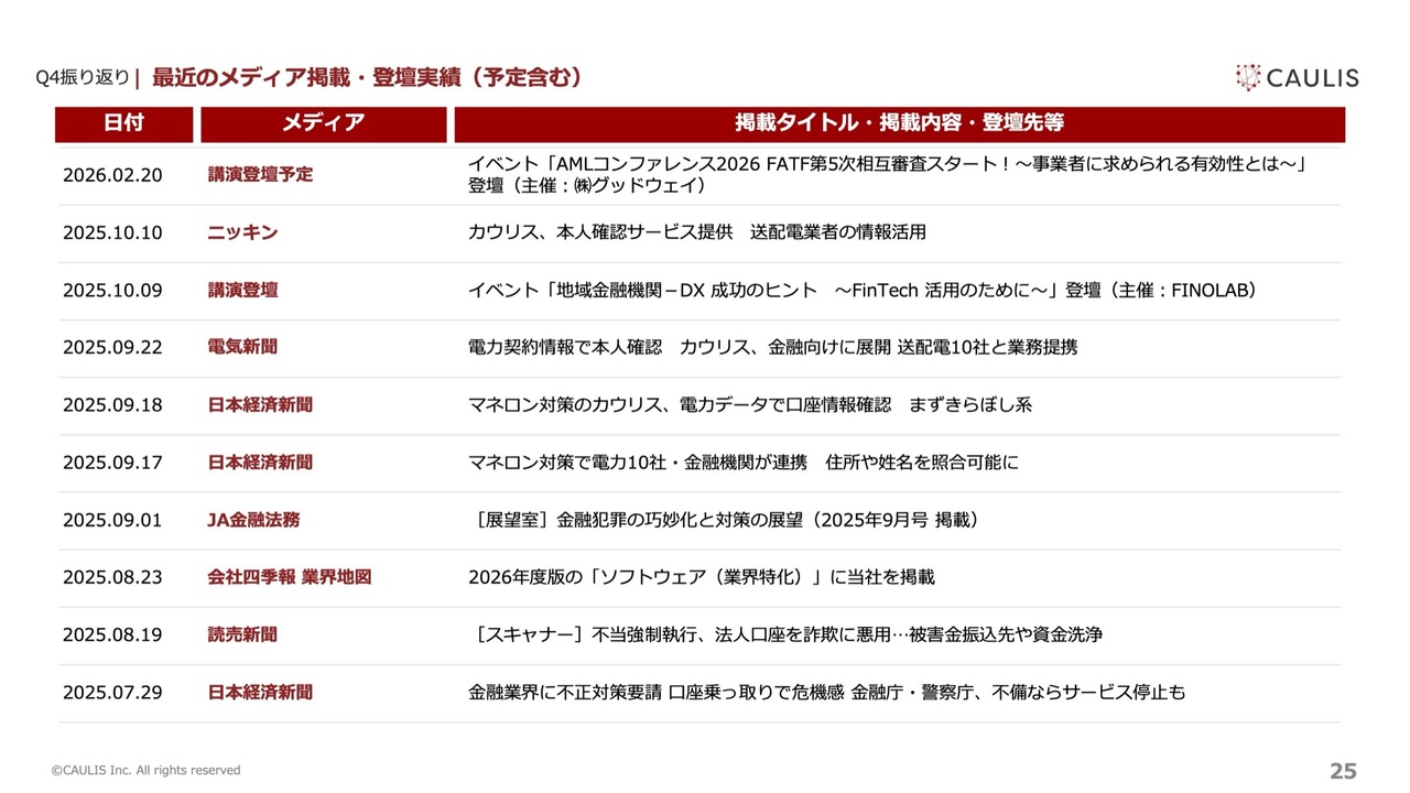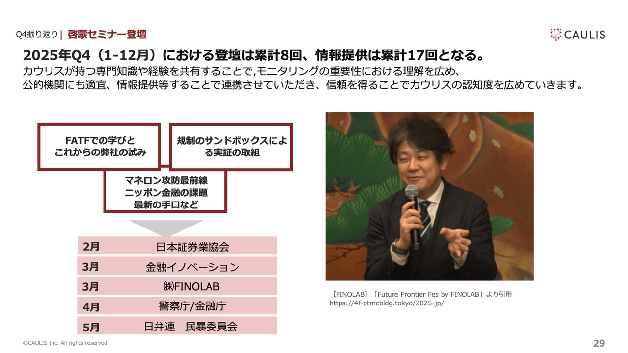 昨年の第4四半期に関しては、オフィシャルな登壇よりも情報交換会のような場が多かったため、正式な説明会登壇はありませんでした。どのように金融犯罪を防いでいくのか、証券口座の乗っ取りをどのように止めていくのかといったトピックが挙がっており、引き続き当局との情報連携を継続していく方針です。