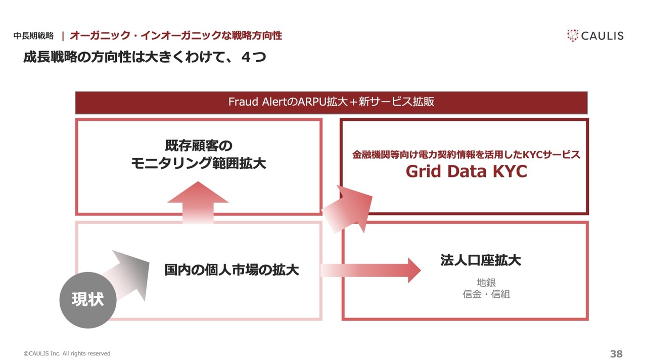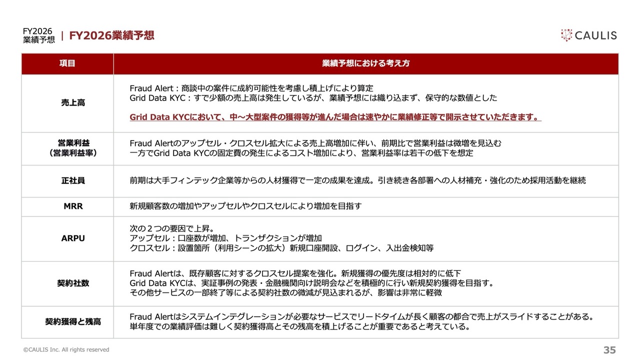 論点としては、新規獲得について、「Fraud Alert」と「Grid Data KYC」という2種類のサービスがあるため、それぞれに関するKPIをお示ししたいと考えています。