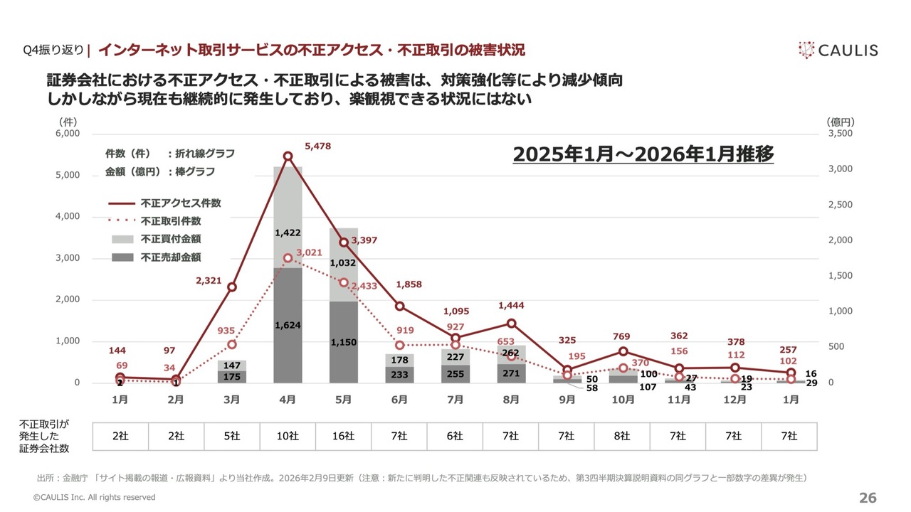 昨年1年間の不正アクセス・不正取引の状況についてご報告します。証券会社においては、3月、4月、5月にスパイクした後、右肩下がりの傾向にあるものの、引き続きアカウントが乗っ取られる事例が発生しており、不正な売買金額は2025年の累計で約7,400億円に達しています。引き続き、証券会社への営業を継続しています。