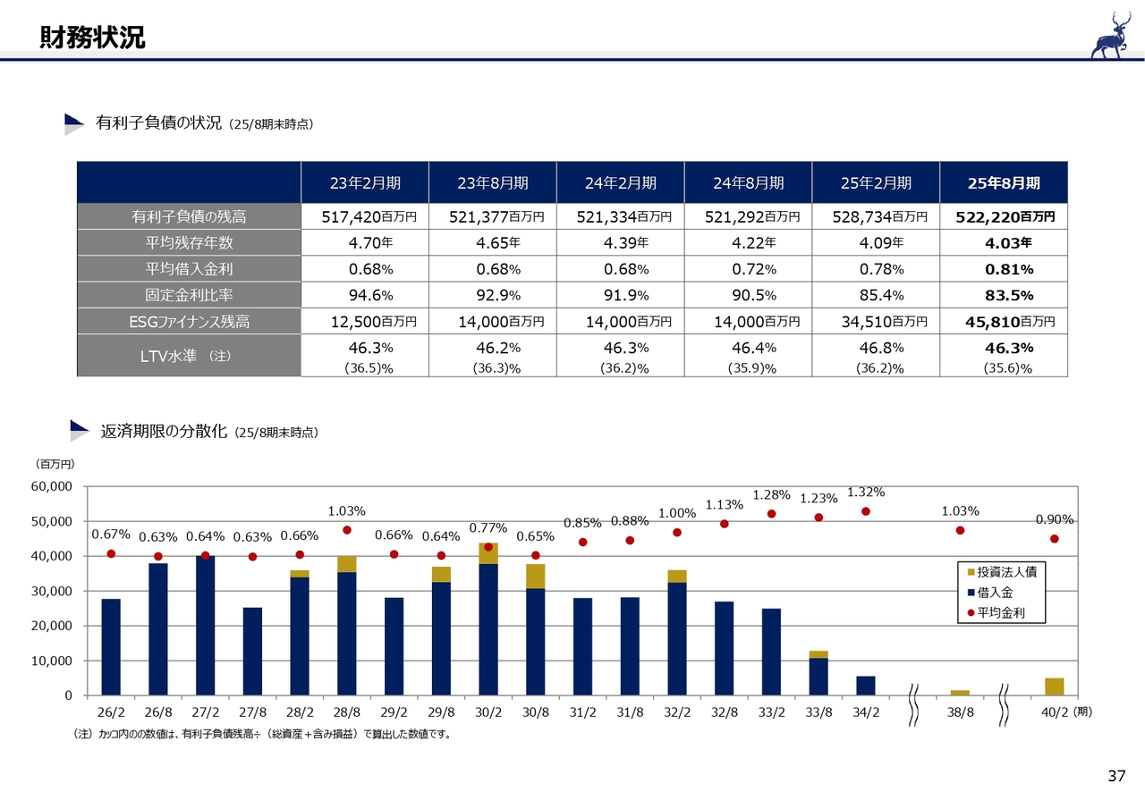 借入の平均残存年限はおおむね3.5年から4年程度で、固定金利比率も70パーセント程度まで緩めていく方針です。