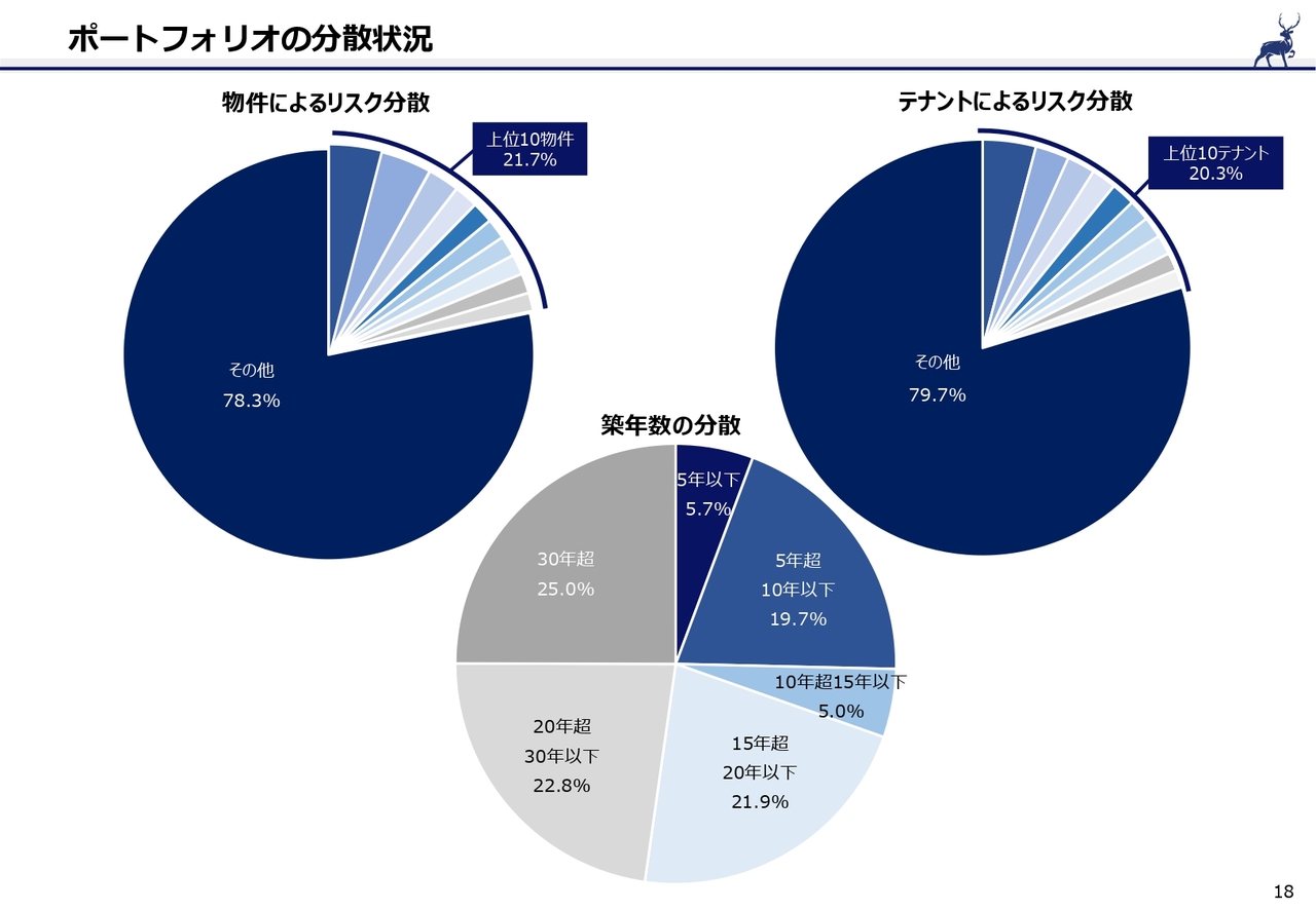 増子:スライド左上は物件、右上はテナントによる分散状況を示したパイグラフです。上位10件で約20パーセントとなっており、集中リスクを低減しています。また、物件の入替を継続しており、下段の表に示しているとおり、築年数の分散も進めています。