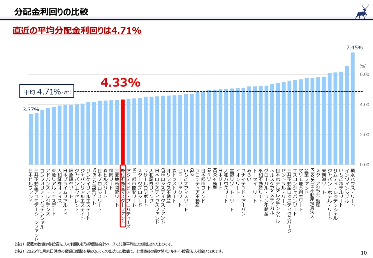 業界平均は4.71パーセントですが、私たちマスターファンドは4.33パーセントとなっています。なお、先ほども申し上げたとおり、分配金は基本的に持続的な賃料収入を源泉としています。