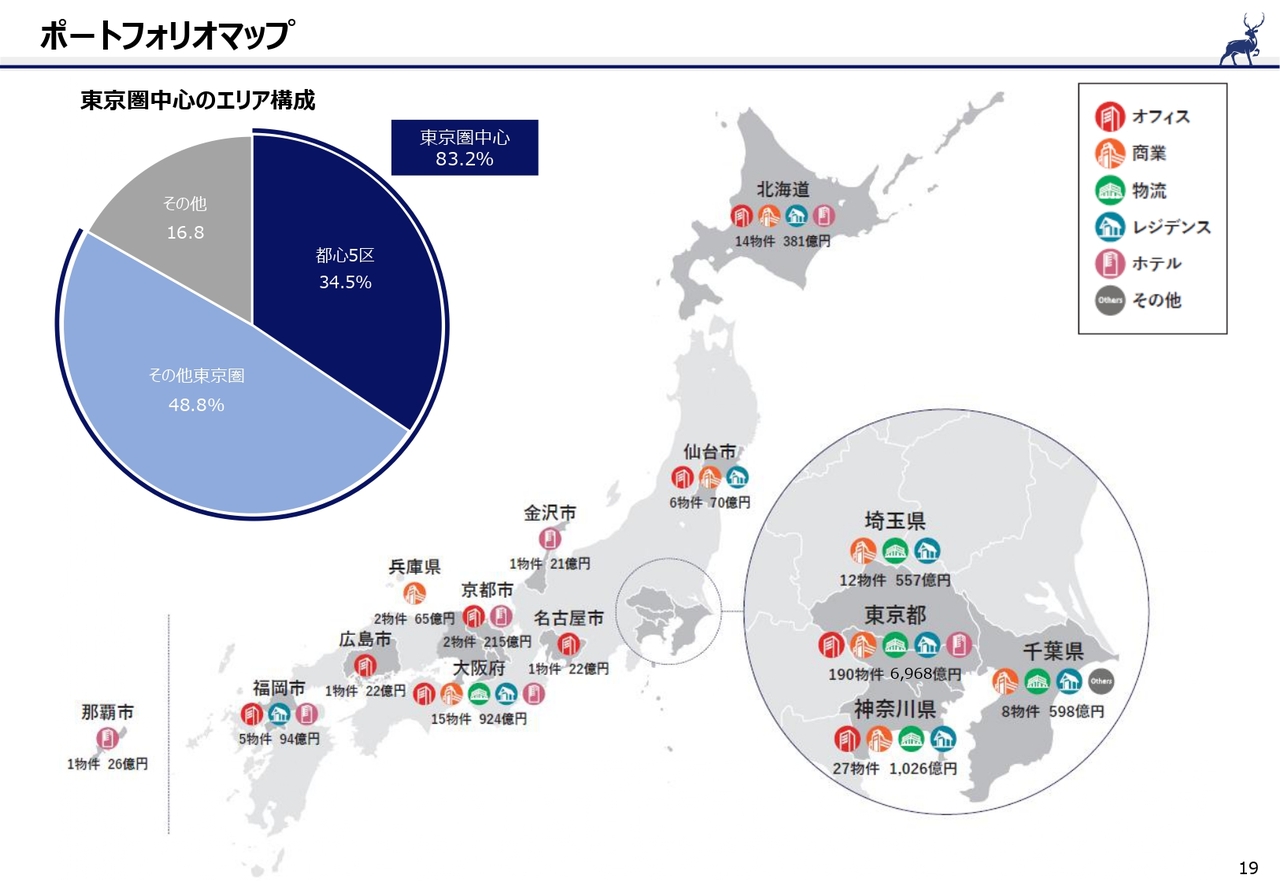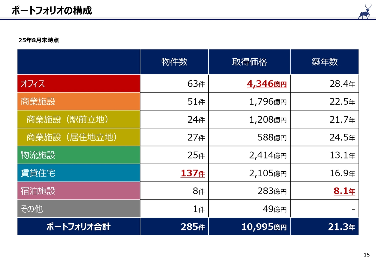 増子:マスターファンドのポートフォリオの内容です。最もシェアが大きいのはオフィスで、赤色で4,346億円と記載しています。物件数が最も多いのは住宅で、137物件を保有しています。また、最下段に記載のとおり、全体で285物件、約1兆1,000億円の不動産を保有しています。