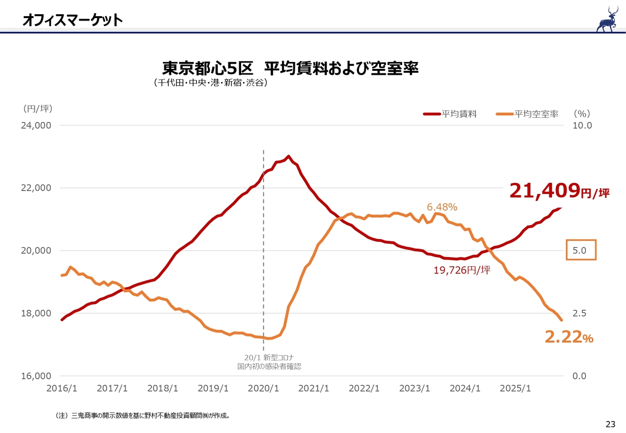 質問:東京都心5区の空室率は2.22パーセントまで低下していますが、2026年から2027年の大量供給リスクをどう見ていますか?