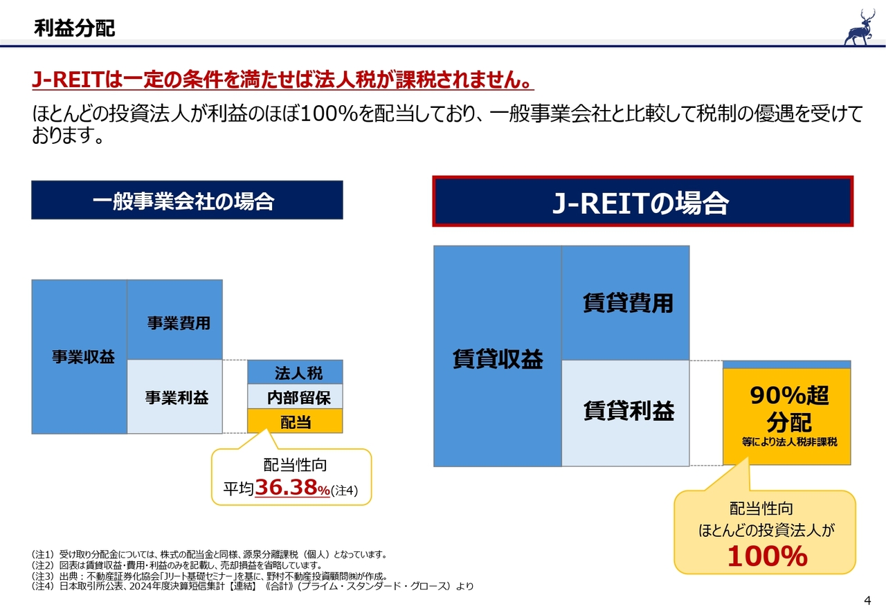 スライド左側に記載した一般事業会社の場合、配当性向は概ね30パーセントから40パーセントです。一方、右側のJ-REITでは、利益の90パーセントを超えて配当することが義務づけられています。