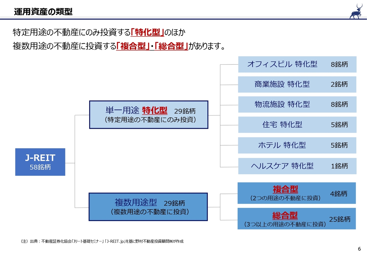 増子:運用資産の累計です。REITは全体で58銘柄あります。特定の用途のみに投資する特化型REITが29銘柄、複数の用途に投資する複合型や総合型のREITが29銘柄と、ちょうど半分ずつになっています。