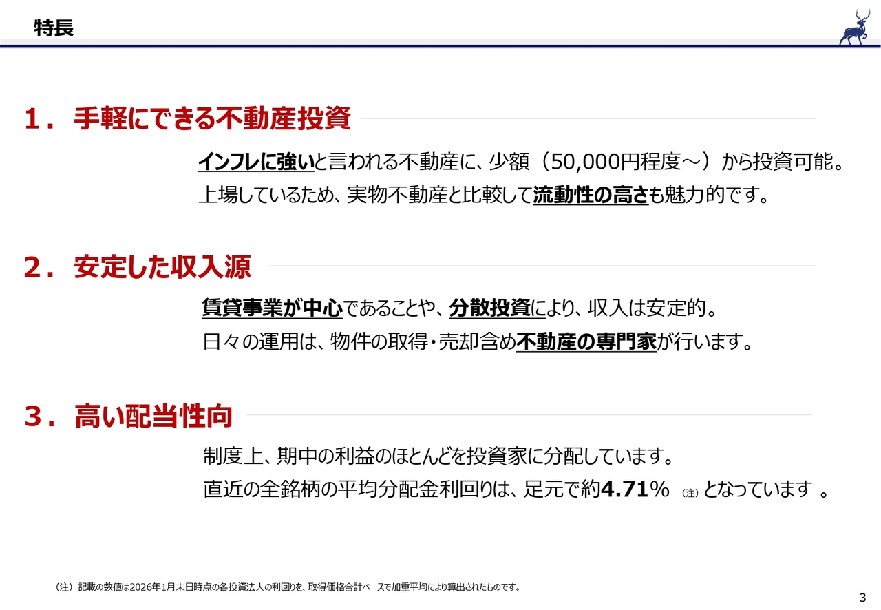 増子:次に、J-REITの特長を大きく3つ挙げています。