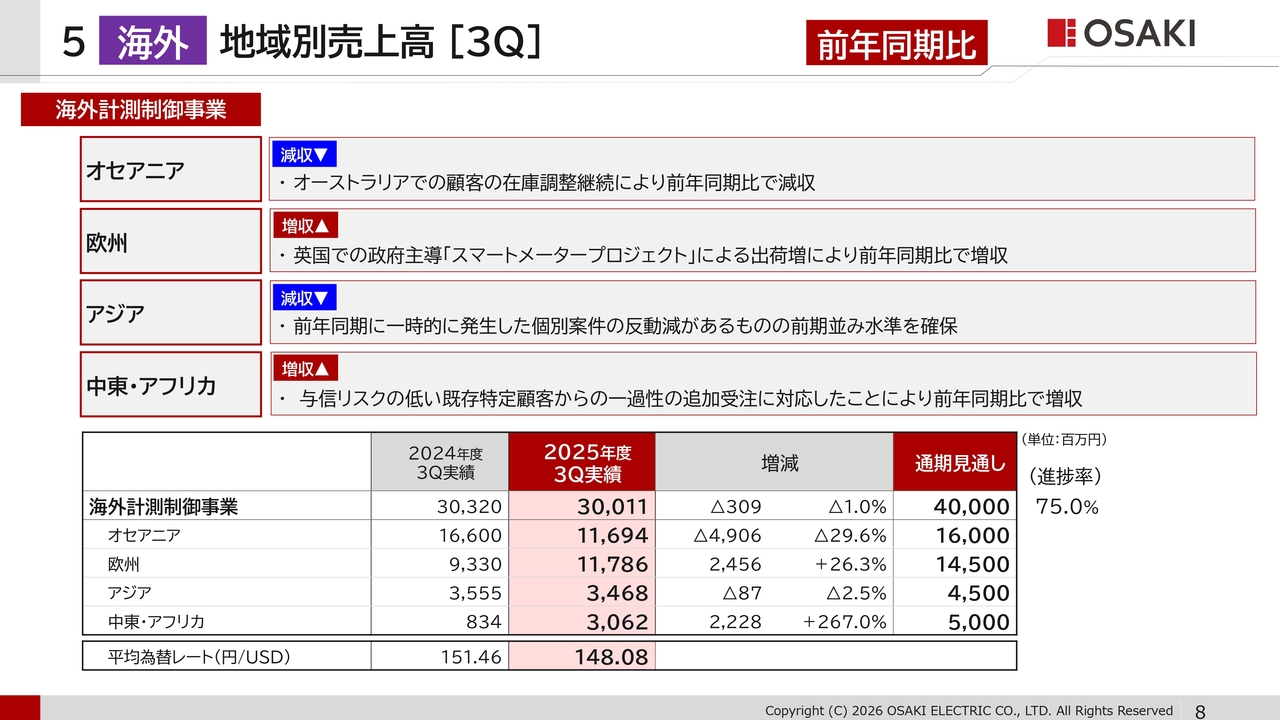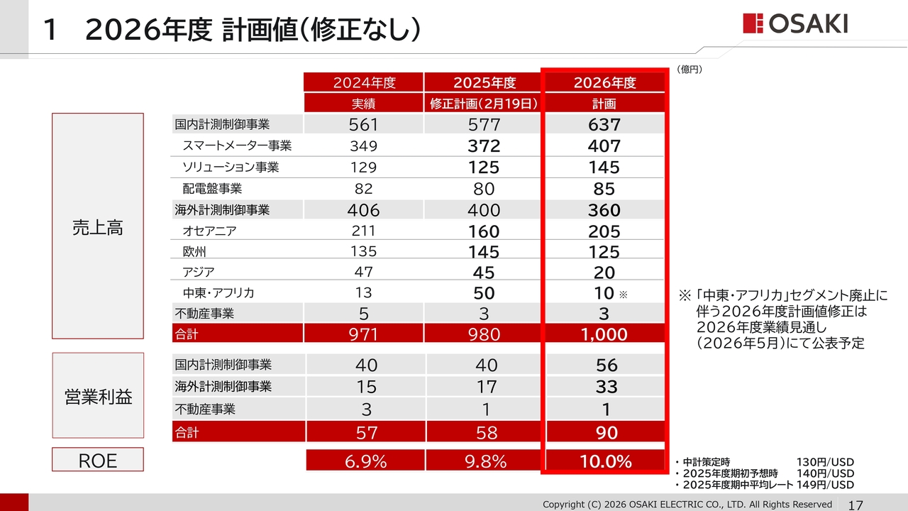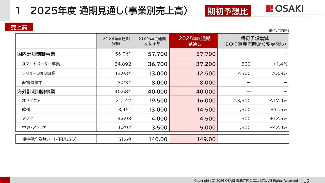 一方、海外については、英国政府主導のスマートメータープロジェクトにより出荷が続く一方、オセアニアの一部お客さまの在庫調整が継続する見通しで、米ドルベースでは減収となりますが、為替レートを円安に見直すことにより、期初予想並みとなる見通しです。