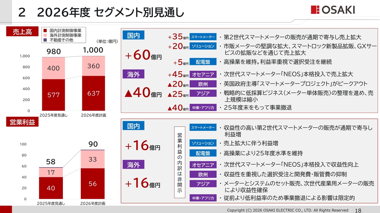 海外では、オセアニアは収益性の高い次世代スマートメーター「NEOS」本格投入により収益性が向上する見込みです。欧州では収益性を重視した選択受注と開発費・販管費の抑制に努めます。