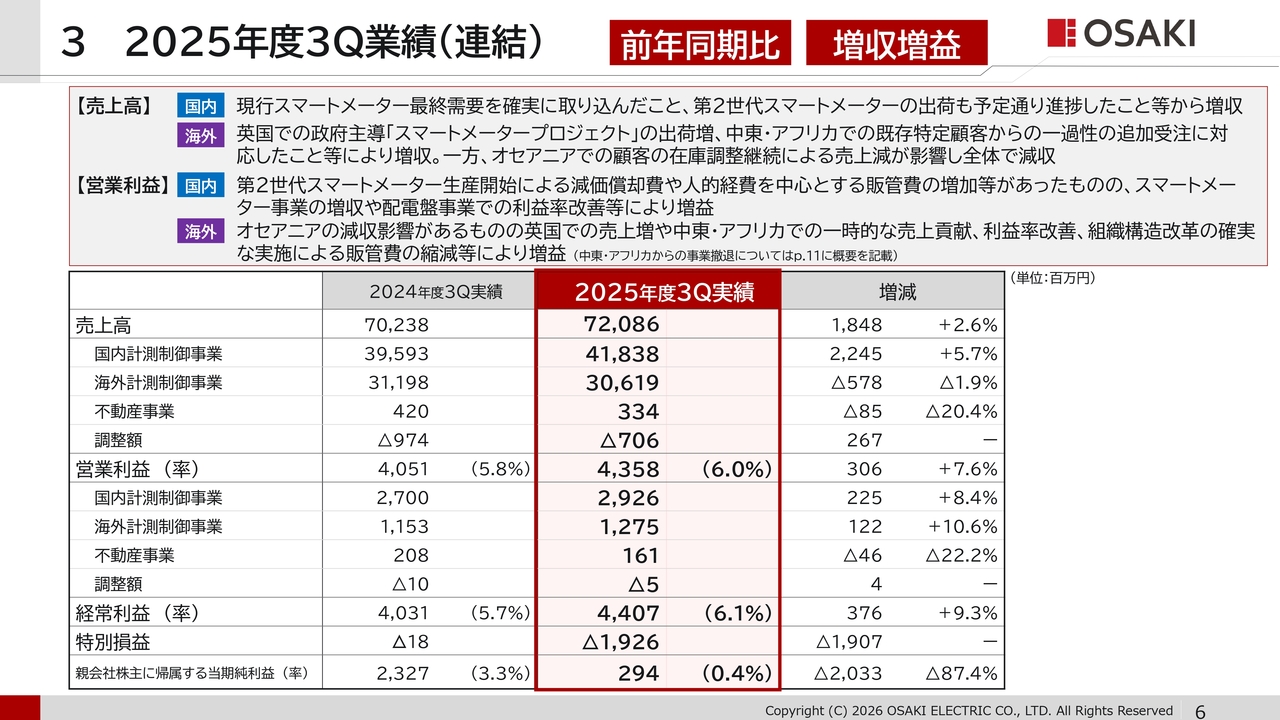 売上高は、国内は現行スマートメーターの最終需要を確実に取り込み、第2世代スマートメーターの出荷も予定どおり進捗したこと等から増収となりました。
