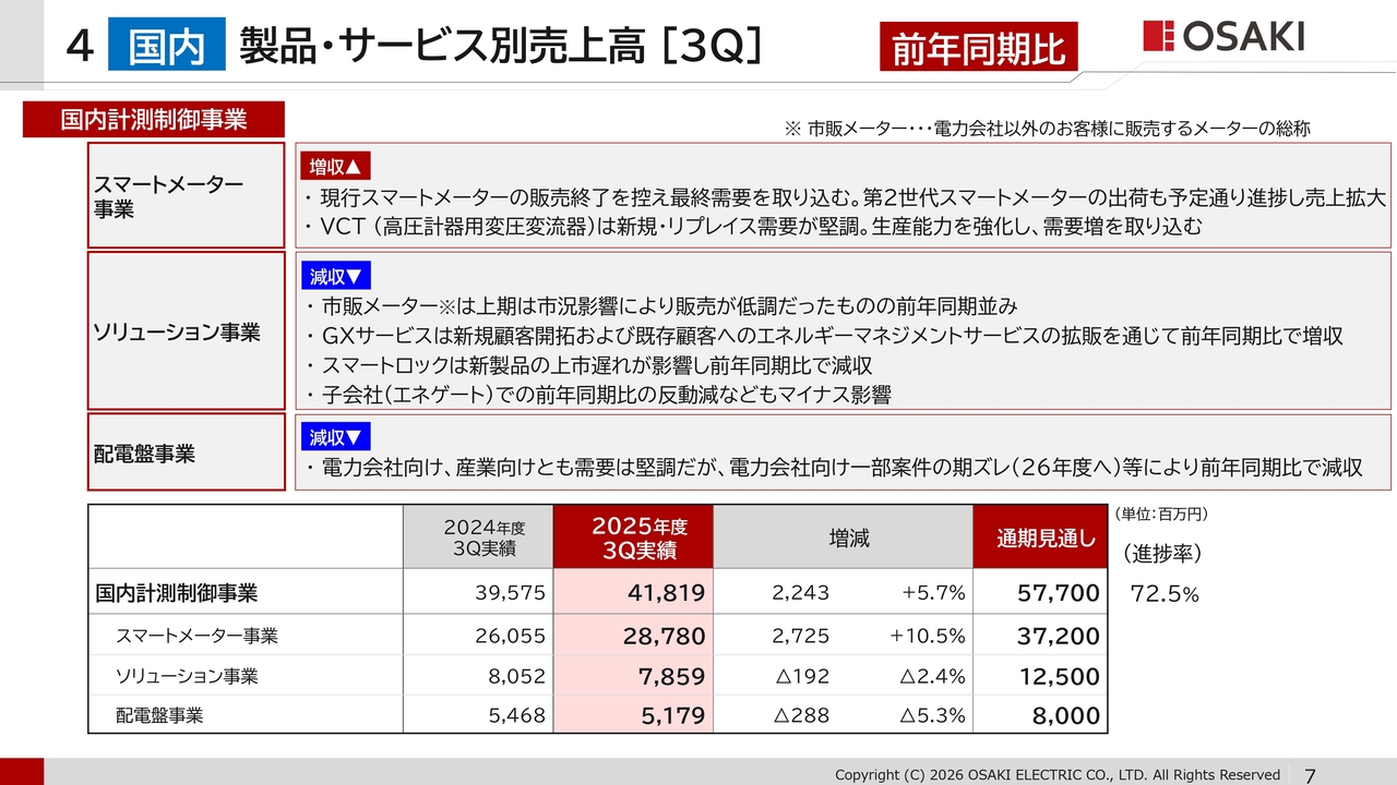 まず、国内計測制御事業ですが、スマートメーター事業は現行機種の最終需要を取り込んだことに加え、第2世代スマートメーターの出荷も予定どおり開始し、売上が拡大しました。また、VCT等の電力会社向け機器の受注、売上も好調で前年同期比で増収となりました。