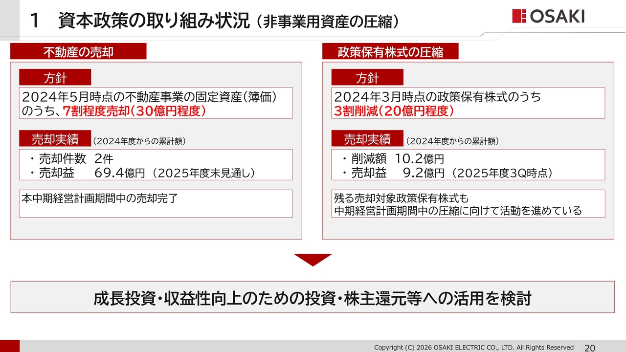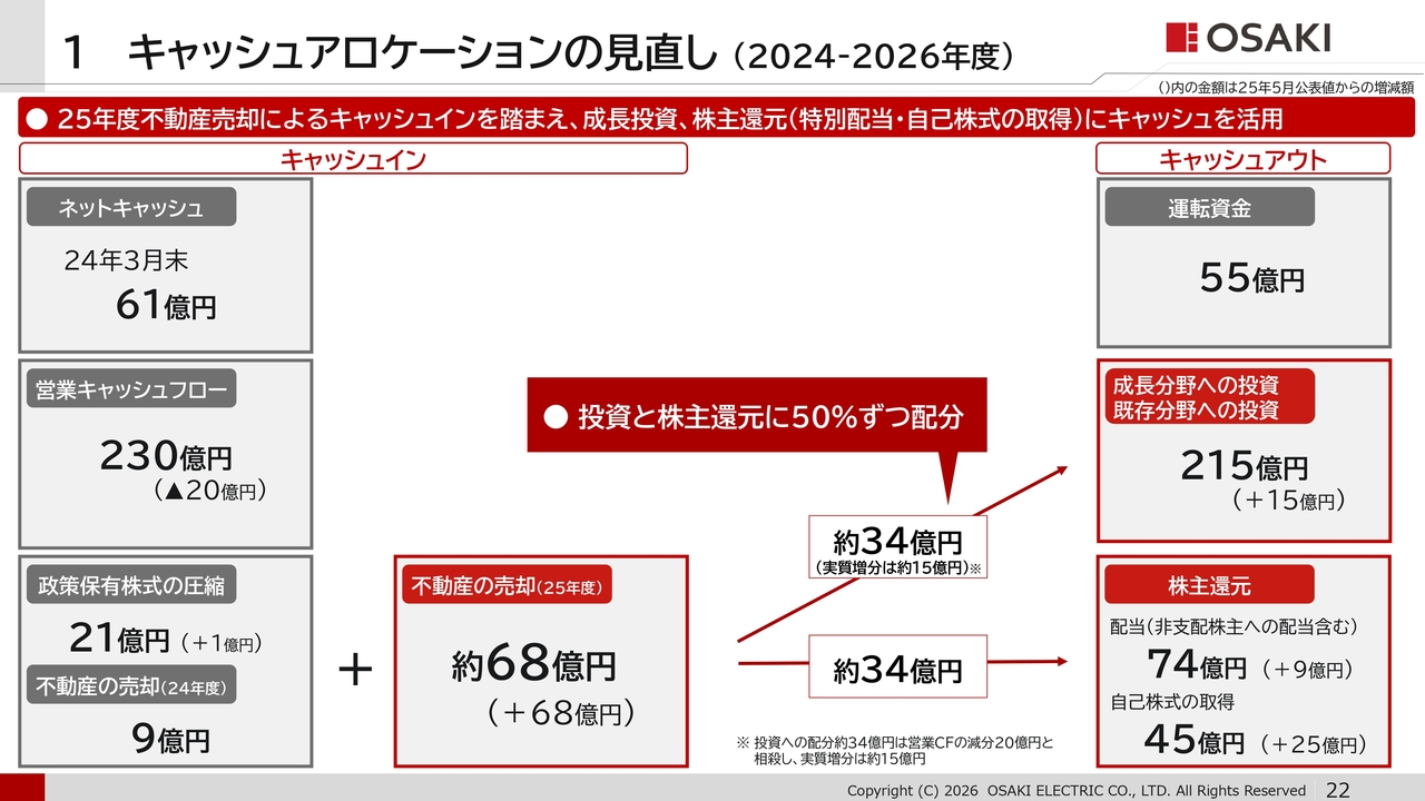 先ほどご説明しました2025年度中の不動産売却により約68億円のキャッシュインが追加で見込まれるため、約50パーセントを投資に振り向け、残り50パーセントを株主還元に充てる方針です。