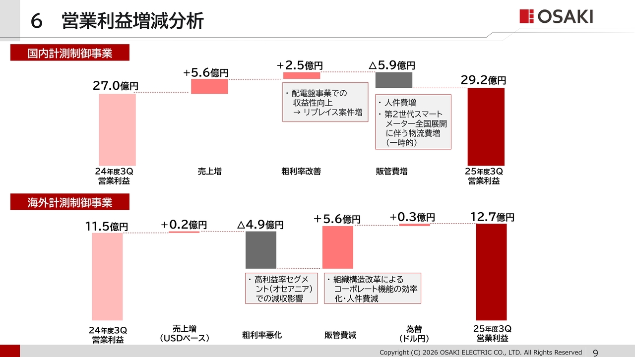 国内は、売上増による増収効果、粗利率の改善等のプラス要因があった一方、賃金改定に伴う人件費増や第2世代スマートメーターの全国展開に伴い一時的に発生する物流費の増加により、ご覧のような水準となっています。