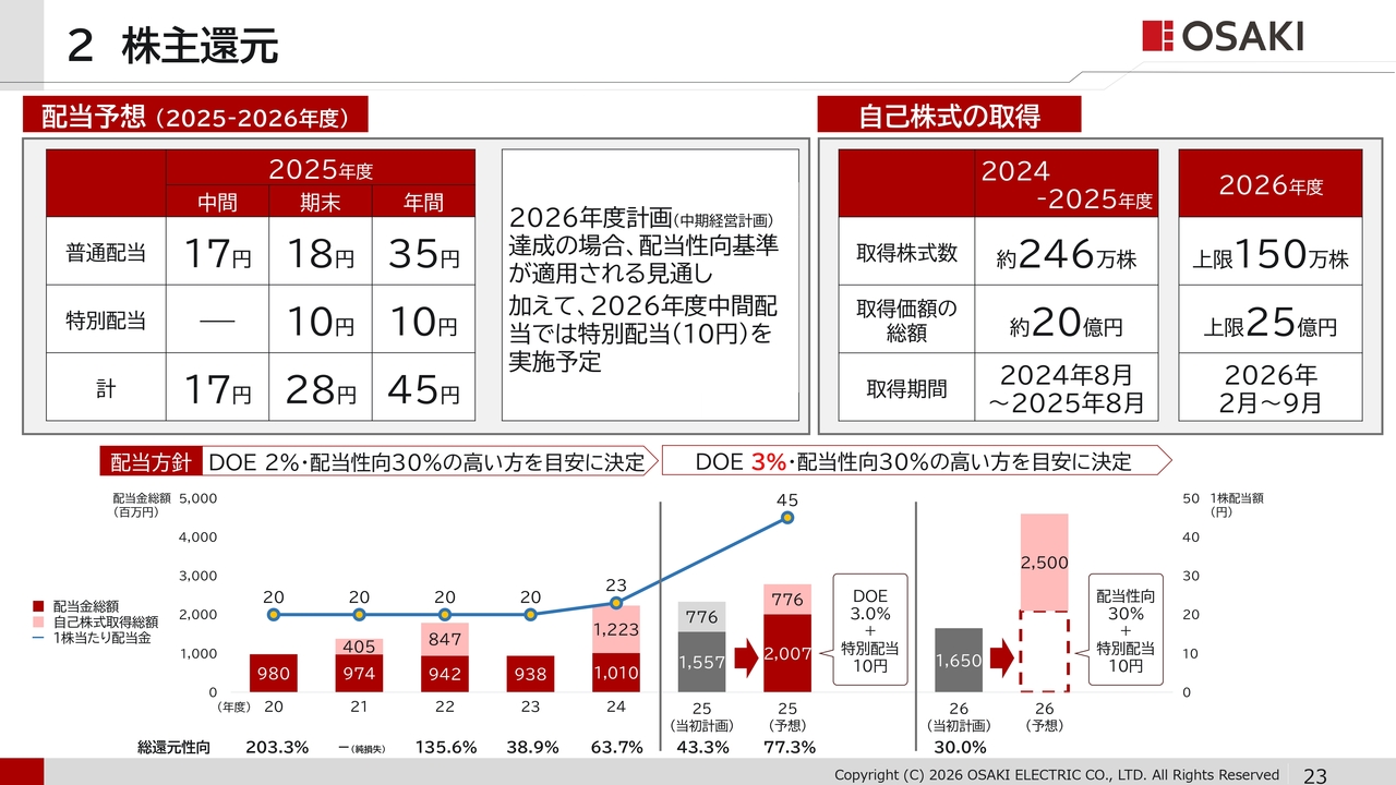 2025年度は、配当方針のDOE基準を2パーセントから3パーセントに引き上げたため、普通配当の年間配当額は1株あたり35円を見込んでいます。