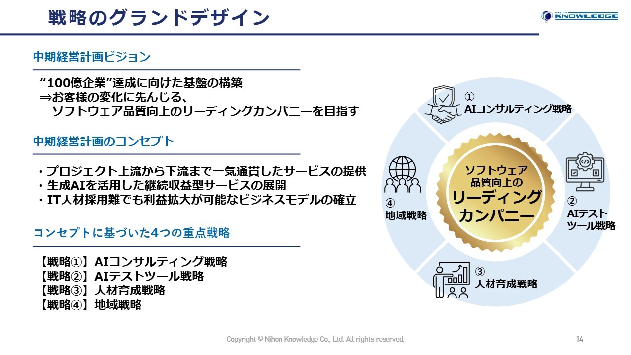 お客さまの変化に先んじる、ソフトウェア品質向上のリーディングカンパニーを目指し、AIコンサルティング戦略、AIテストツール戦略、人材育成戦略、地域戦略の4つの重点戦略を実行していきます。