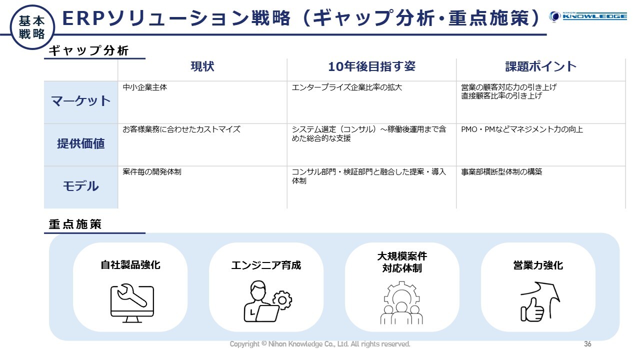 開発事業の主力であるERPソリューション戦略のギャップ分析については、スライドに記載のとおりです。引き続き対象業種を追加していきます。
