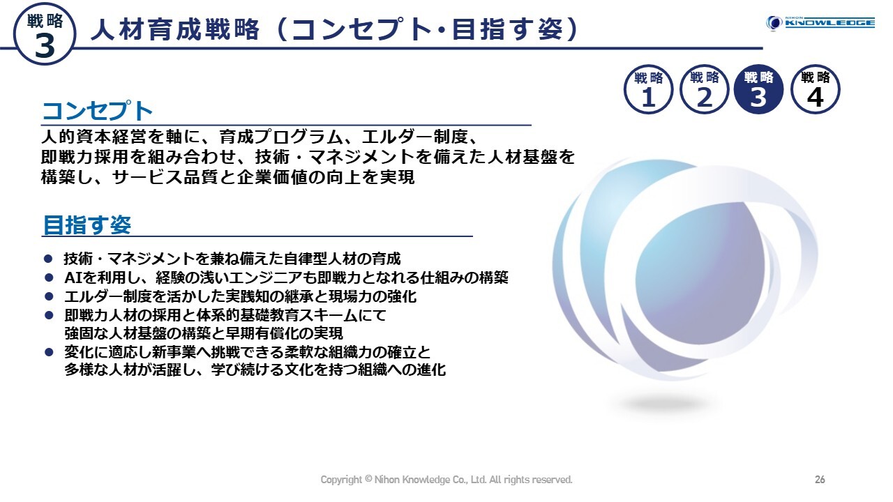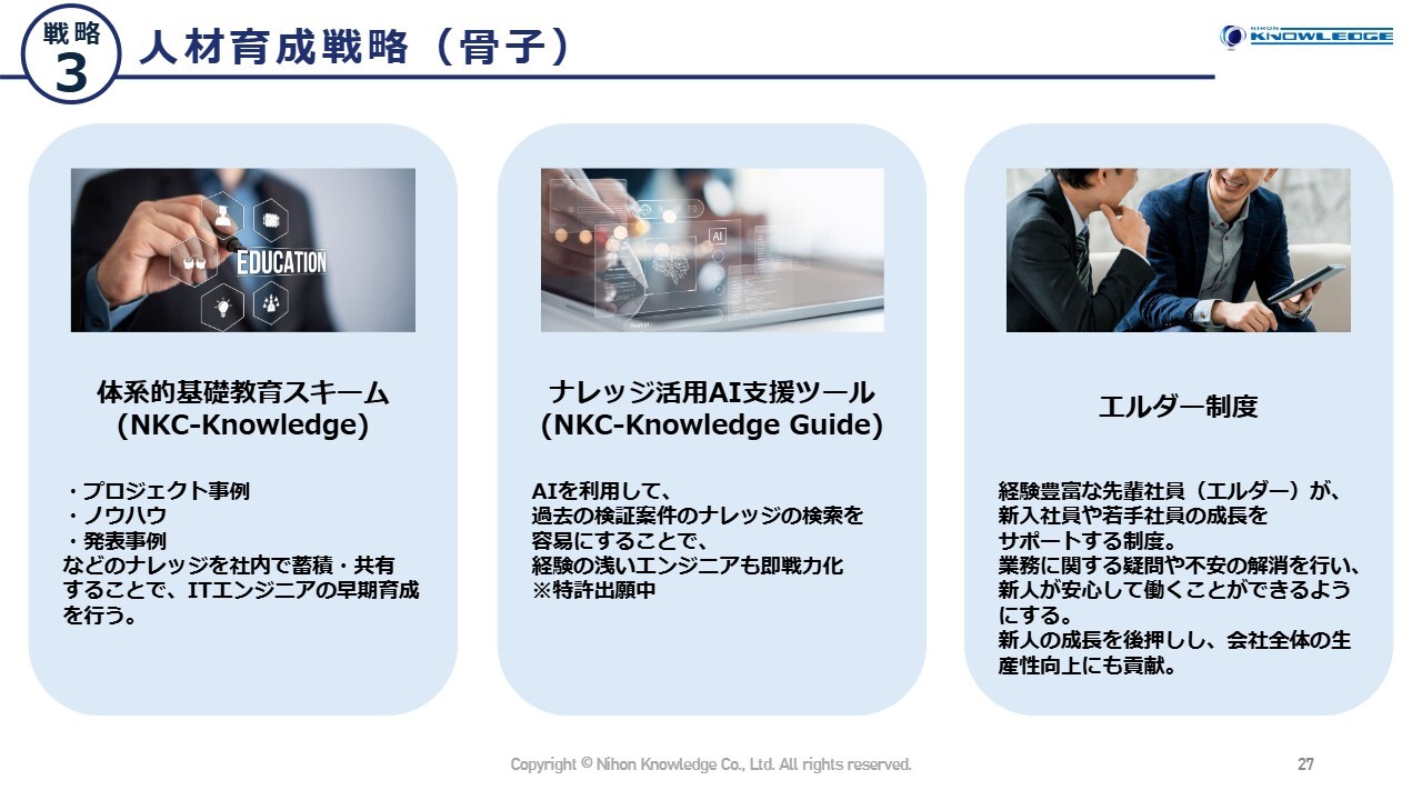 重点戦略の3つ目は、人材育成戦略です。これは、これまで当社が最も重要視してきた戦略です。1年目の新人には2年目・3年目の先輩が寄り添って指導するエルダー制度の導入をはじめ、独自の育成プランを実施します。