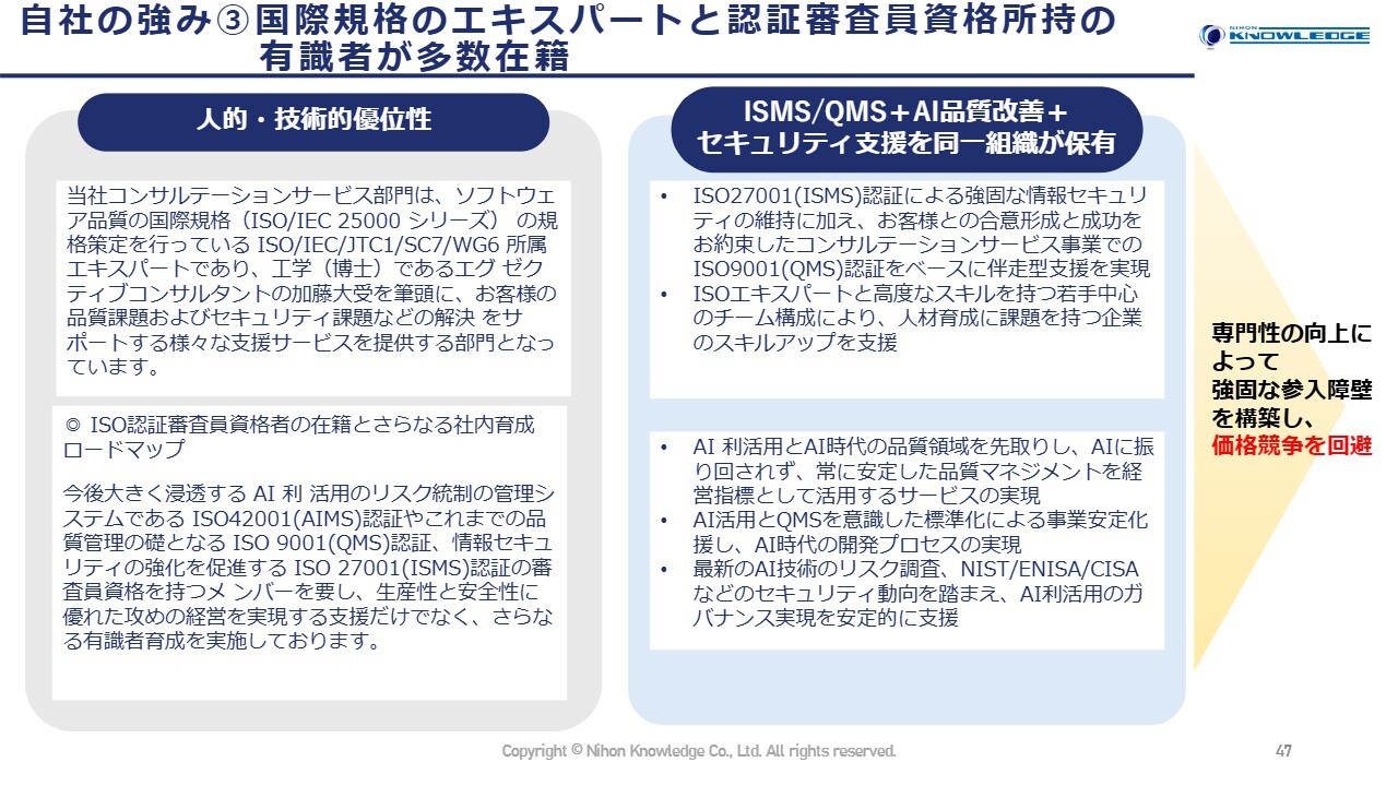 自社の強み③ 国際規格のエキスパートと認証審査員資格所持の有識者が多数在籍