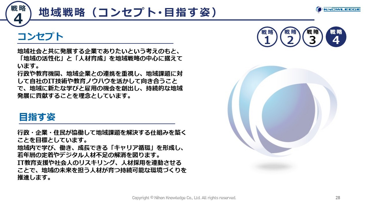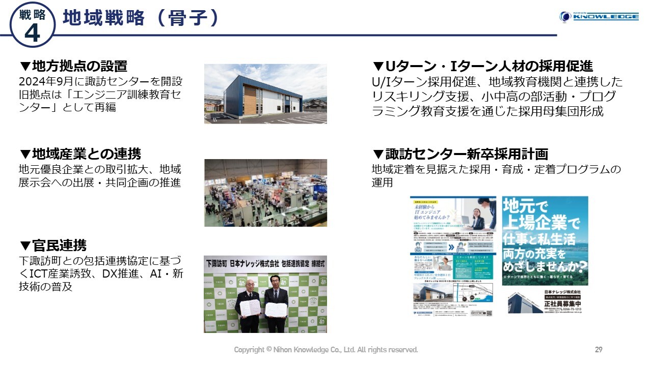 重点戦略の4つ目は地域戦略です。当社の特徴である地域の活性化と人材育成を、地域戦略の中心に据えています。