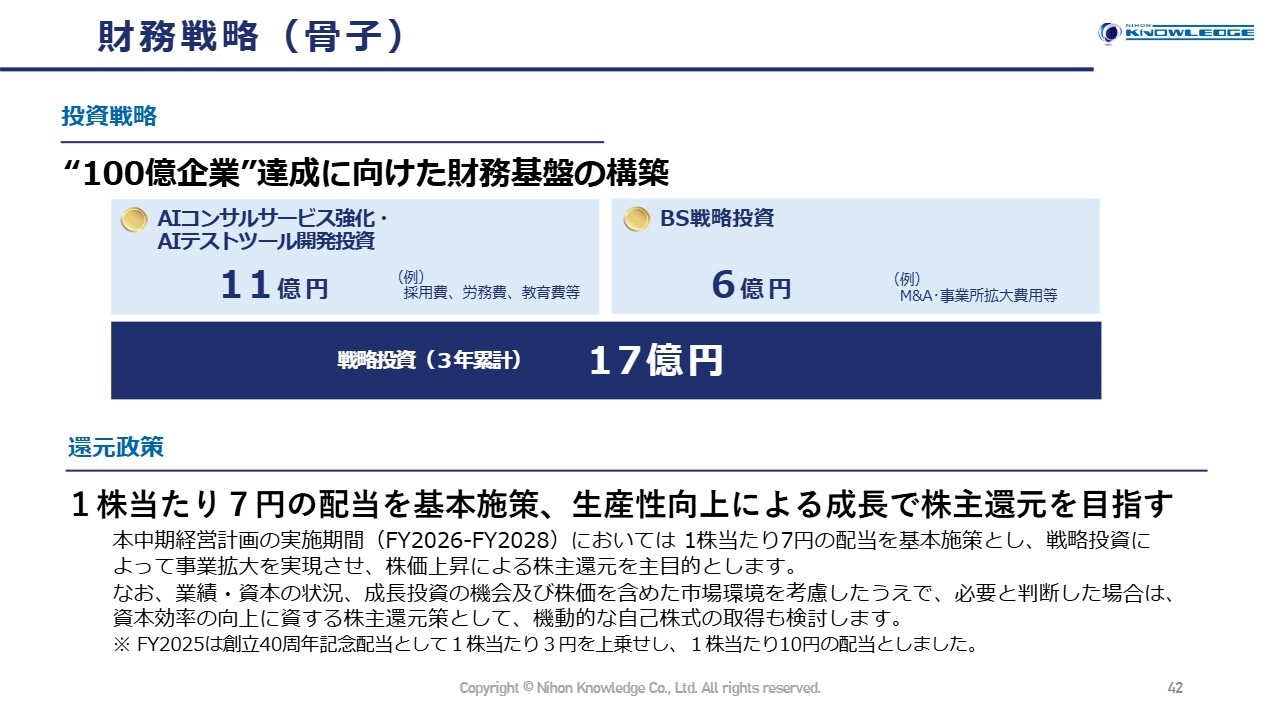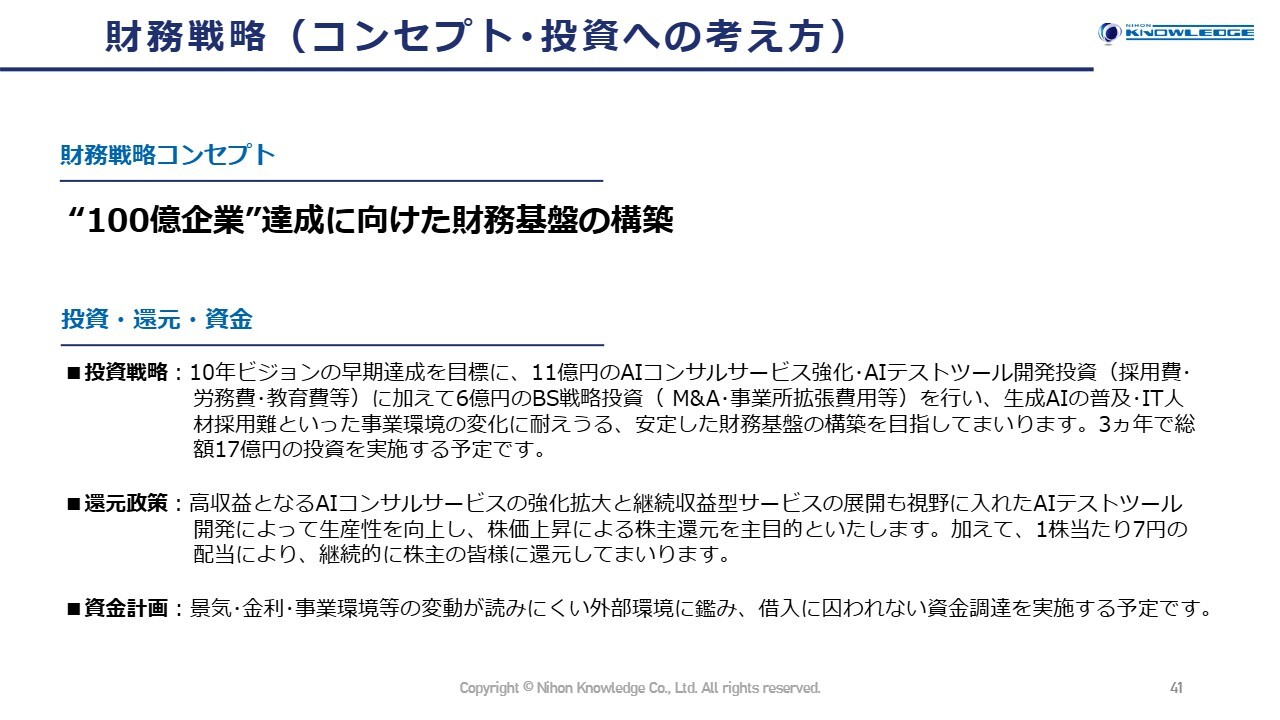 財務戦略では、「100億企業」の達成に向けて財務基盤の構築を目指します。そのために、AIテストツールの開発やM&A投資を積極的に進めるとともに、配当などの株主還元を確実に実行していきます。また、必要な資金調達のために増資なども検討していきます。