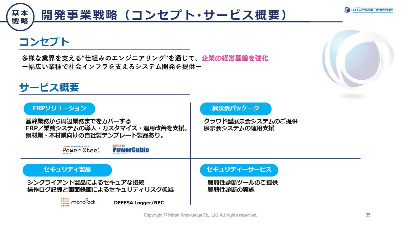 開発事業では、これまでの鋼材業や木材業だけでなく、幅広い業種に向けて社会インフラを支えるシステム開発を提供していきます。また、収益性の高い展示会サービスやセキュリティサービスについても、新たなサービスの提供を進めていきます。