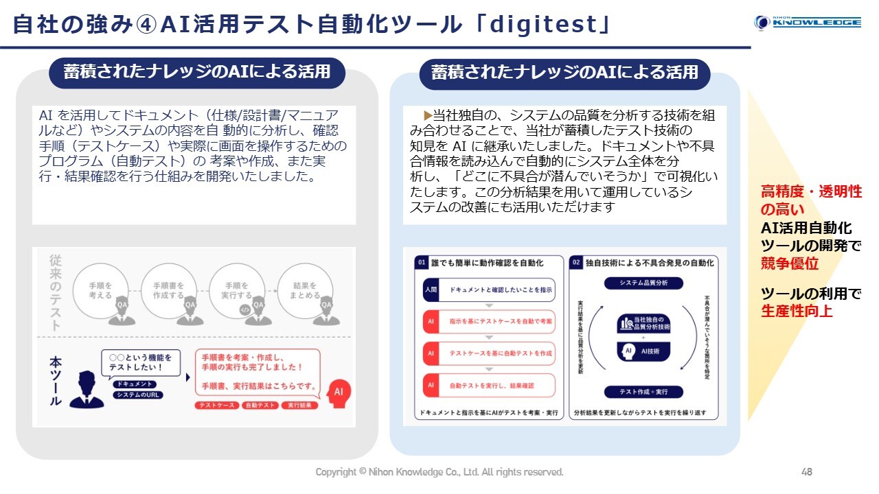 自社の強みの4つ目である、AI活用のテスト自動化ツール「digitest」についてです。テスト専門会社が、自社で開発できないAIテストツールの提供を開始します。このツールは、開発事業とテスト事業の2つを融合させたサービスとなっています。