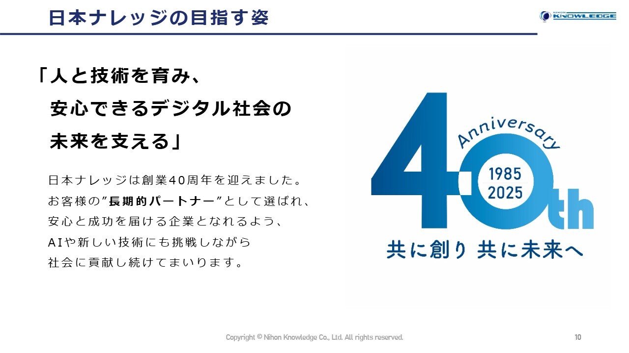 概要をご説明します。おかげさまで、2025年10月に創業40周年を迎えることとなりました。「共に創り 共に未来へ」の実現に向けて邁進していきます。