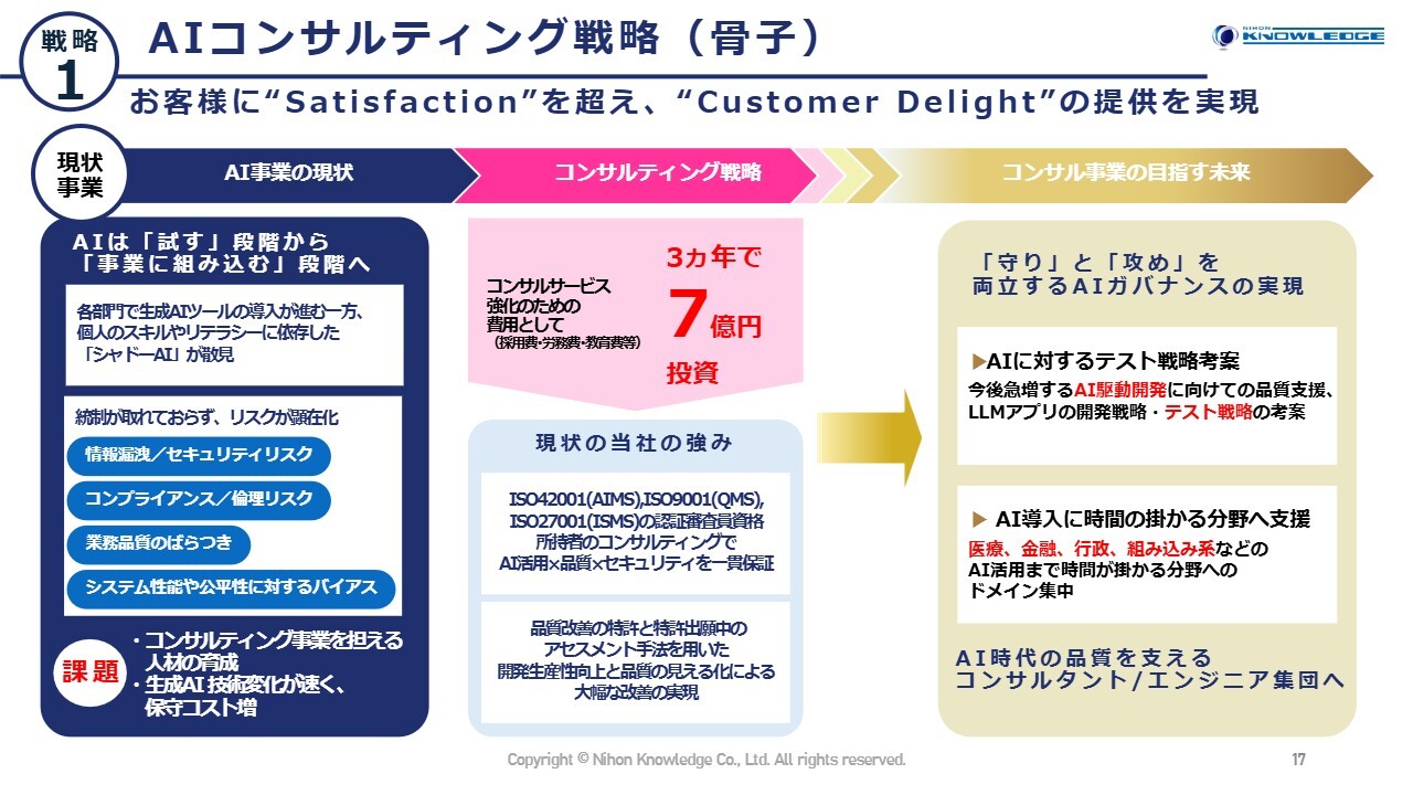 4つの重点戦略の1つ目であるAIコンサルティング戦略についてです。こちらは、AIの活用を検討しているものの、自社だけでは導入がうまくいかない企業に寄り添い、期待を超える効果を提供するサービスです。