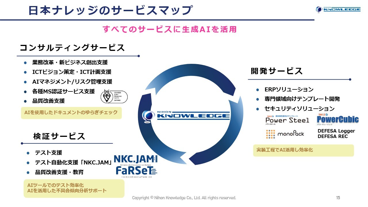 当社が提供する事業サービスは従来どおり、コンサルティングサービス事業、検証サービス事業、開発サービス事業の3つです。このすべての事業でAIを活用し、効率向上を進めていきます。