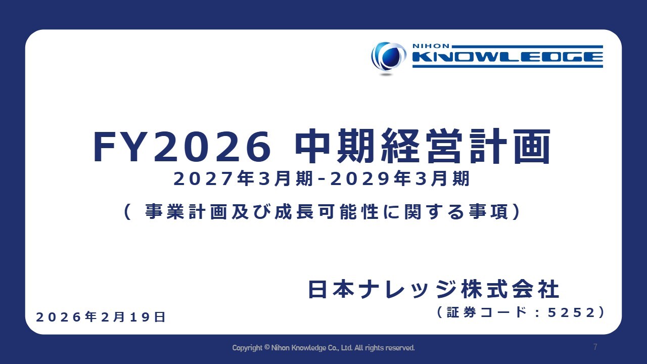 藤井洋一氏:日本ナレッジ株式会社代表取締役の藤井です。よろしくお願いします。本日は、2026年3月期第3四半期決算説明および中期経営計画についてご説明します。