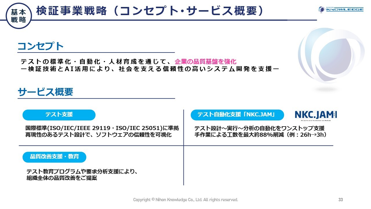 その実現のコンセプトは3つあります。1つ目は、テストのみを単体で引き受けるのではなく、開発事業の強みを活かし、プロジェクトの上流から下流まで一気通貫したサービスを提供します。2つ目は、冒頭でお話しした徹底的なAIの活用です。3つ目は、IT人材確保が難しくなる状況下においても、AIの活用により拡大するビジネスモデルの構築を進めていきます。