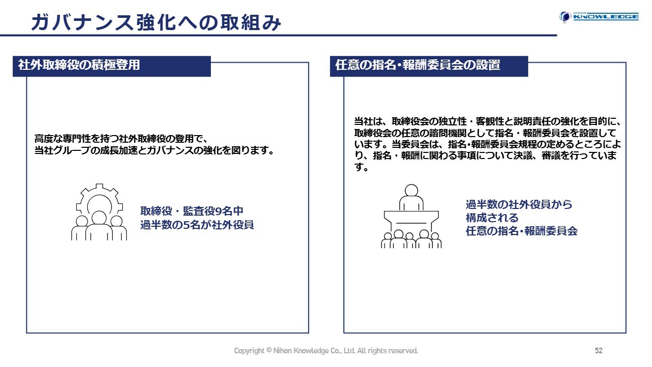 企業の健全化を進めるため、社外役員を過半数とするなど、ガバナンス強化にも積極的に取り組んでいます。