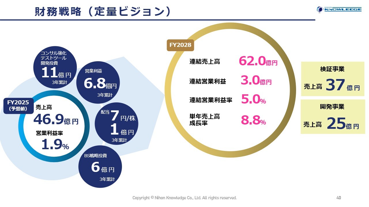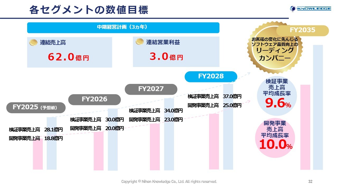 各セグメントの数値目標はスライドのとおりです。検証事業と開発事業の比率は6:4と従来どおりの計画です。それぞれの売上高成長率は、検証事業が9.6パーセント、開発事業が10.0パーセントとなります。検証事業の成長率を低めに設定しているのは、人材による単純テストの減少を考慮した結果です。